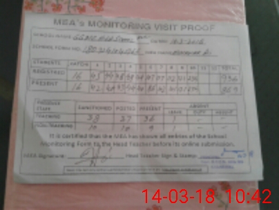 | Attendance Register | Head Teacher | MEA with School | Visit Proof |