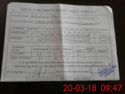 | Attendance Register | Head Teacher | MEA with School | Visit Proof |