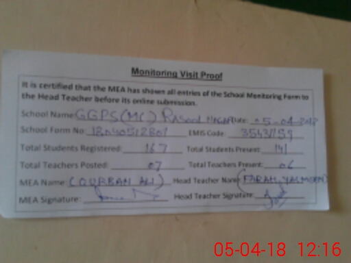 | Attendance Register | Head Teacher | MEA with School | Visit Proof |