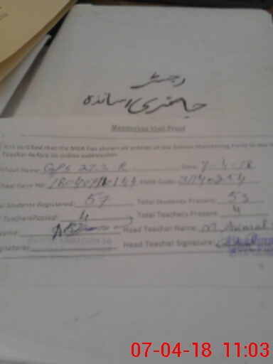 | EMIS Code: 31140254 | Name of School: GPS CHAK NO.27/3-R | |||