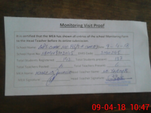 | School Visited by School Health & Nutrition Supervisor (No. of Visits) | 1 | Name1: | M EJAZ SABIR | Name2: | |