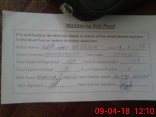 | School Visited by School Health & Nutrition Supervisor (No. of Visits) | 1 | Name1: | M EJAZ SABIR | Name2: | |