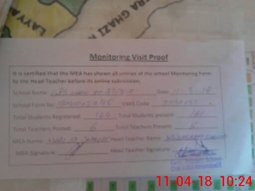 | Attendance Register | Head Teacher | MEA with School | Visit Proof |