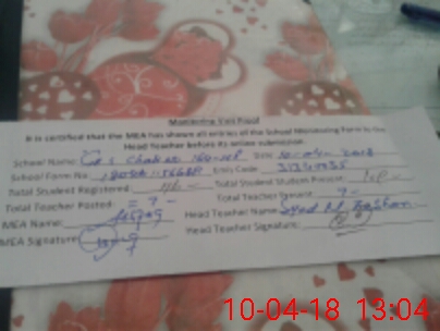 | Attendance Register | Head Teacher | MEA with School | Visit Proof |
