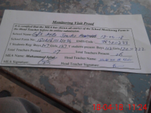 | Total no. of Classrooms: 5 No. of Classrooms Used for Teaching: 5 No. of Classrooms Storing Old Furniture, FTBs, etc: 0Comments if Any: No furniture Teacher G sarwar duty at display centre |