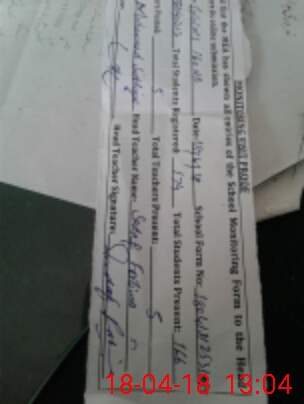 | School Visited by School Health & Nutrition Supervisor (No. of Visits) | 1 | Name1: | KHAWER HAYAT SHAH | Name2: | |