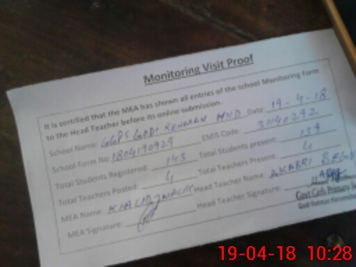 | Attendance Register | Head Teacher | MEA with School | Visit Proof |