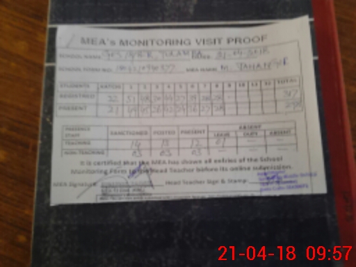 | Attendance Register | Head Teacher | MEA with School | Visit Proof |