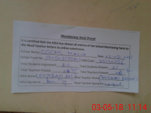 | Attendance Register | Head Teacher | MEA with School | Visit Proof |