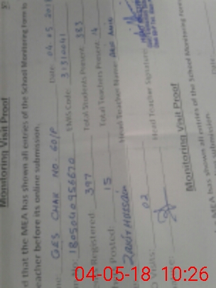 | Monitoring Date: 04-05-2018 | Start Time: 04-05-2018 09:56 AM | End Time: 04-05-2018 10:45 AM | Name of MEA: Za**** Hu**** | |