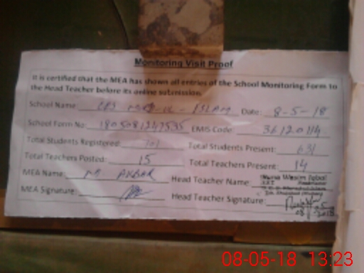 | Certified that this School was Inspected by the Undersigned MEA/DMO Today and the Information Stated Above is as Per Record. | |||||