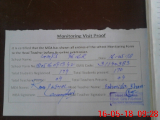 | Attendance Register | Head Teacher | MEA with School | Visit Proof |