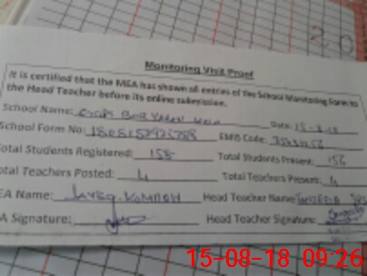| Attendance Register | Head Teacher | MEA with School | Visit Proof |