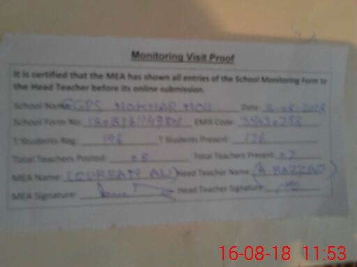 | Attendance Register | Head Teacher | MEA with School | Visit Proof |