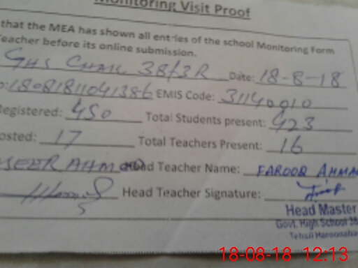 | EMIS Code: 31140010 | Name of School: GHS CHAK 38/3R | |||