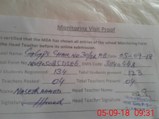 | Attendance Register | Head Teacher | MEA with School | Visit Proof |