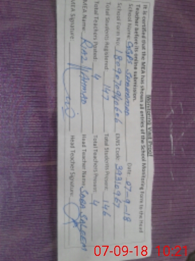 | Attendance Register | Head Teacher | MEA with School | Visit Proof |