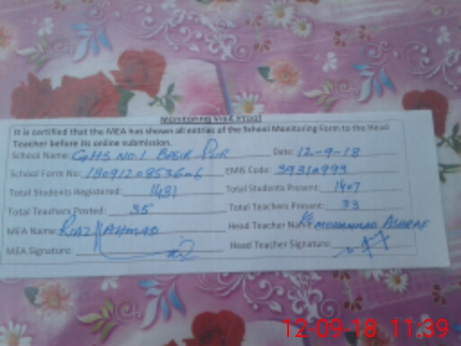 | EMIS Code: 39310993 | Name of School: GHS NO. 1 BASIR PUR MAIN ROAD | |||