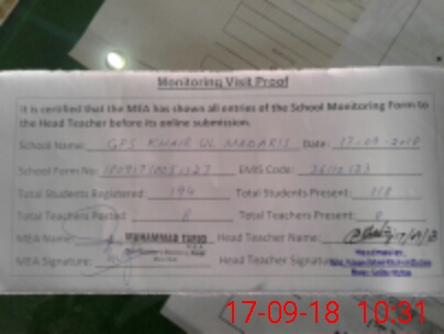 | EMIS Code: 36110123 | Name of School: GPS KHAIR-UL-MADARIS AURANGZEB ROAD MOHALLA GAOWSHALA | |||