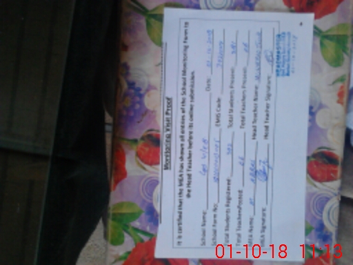 | School Visited by School Health & Nutrition Supervisor (No. of Visits) | 1 | Name1: | REHANA SHARIF | Name2: | NIL |