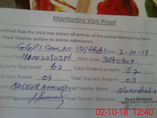 | EMIS Code: 31140409 | Name of School: GGPS CHAK NO 131/6-R EAST | |||
