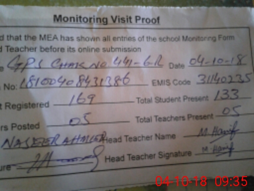| Attendance Register | Head Teacher | MEA with School | Visit Proof |