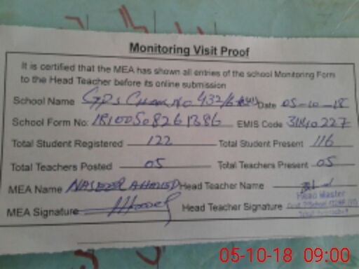 | Certified that this School was Inspected by the Undersigned MEA/DMO Today and the Information Stated Above is as Per Record. | |||||