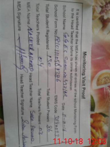 | Remarks (Use Separate Page if Required): SIR TODAY ON 11 10 2018 AT ABOUT 10 56 I VISIT THE GGES CHAK NO 437 6R DUERING HEAD COUNTING ONE TEACHER PRESENT IN THE CLASS HER NAME IS PERVEEN ZAHOOR SHE IS RETIRED FROM SERVICE IN STED OF RAZIA SHARIF MA PET ABSENT WITH OUT LEAVE | |||||