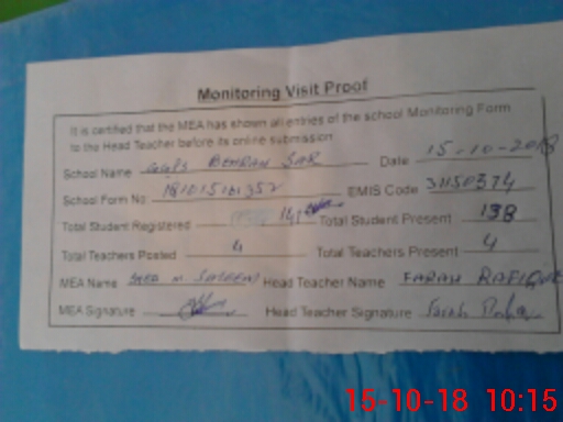 | Attendance Register | Head Teacher | MEA with School | Visit Proof |