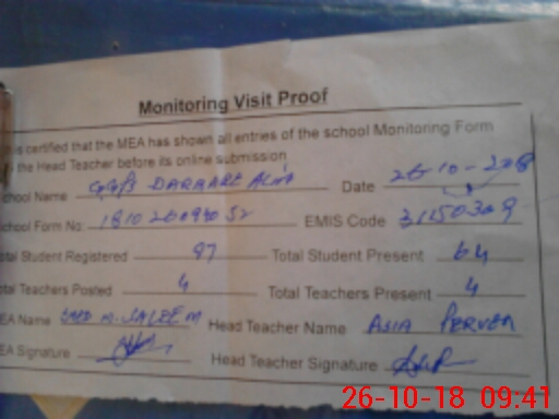 | Attendance Register | Head Teacher | MEA with School | Visit Proof |