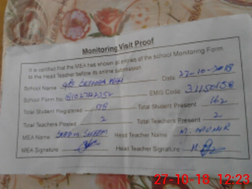| Attendance Register | Head Teacher | MEA with School | Visit Proof |
