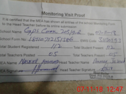 | EMIS Code: 31130193 | Name of School: GPS CHAK NO.205/9-R | |||