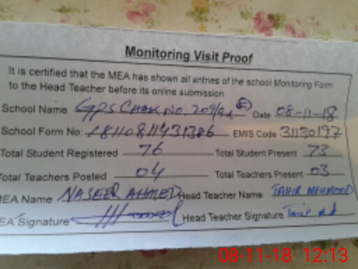 | Attendance Register | Head Teacher | MEA with School | Visit Proof |