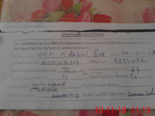 | Attendance Register | Head Teacher | MEA with School | Visit Proof |