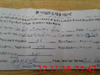 | School Visited by School Health & Nutrition Supervisor (No. of Visits) | 1 | Name1: | Shamvail | Name2: | Nil |