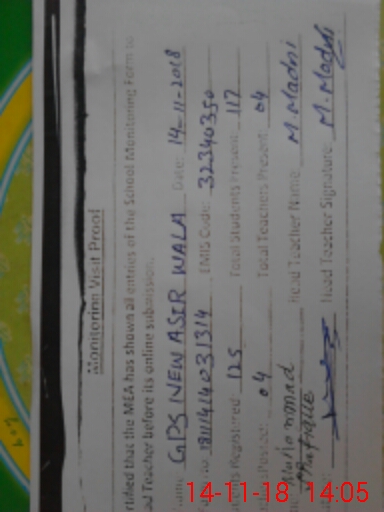 | EMIS Code: 32340350 | Name of School: GPS NEW ASIR WALA | |||