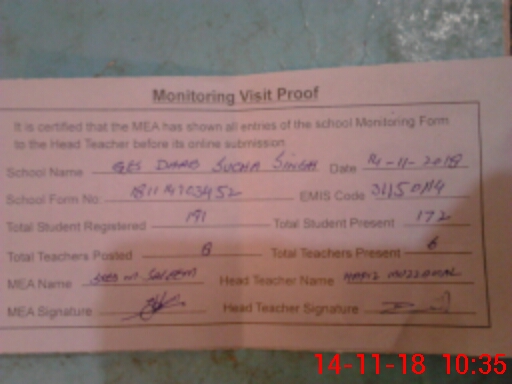 | EMIS Code: 31150114 | Name of School: GES DHAB SUCHA SINGH | |||