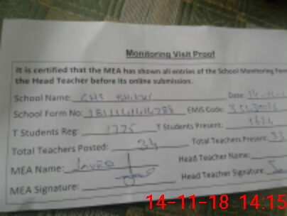 | Attendance Register | Head Teacher | MEA with School | Visit Proof |