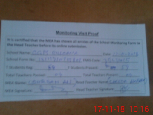| Attendance Register | Head Teacher | MEA with School | Visit Proof |