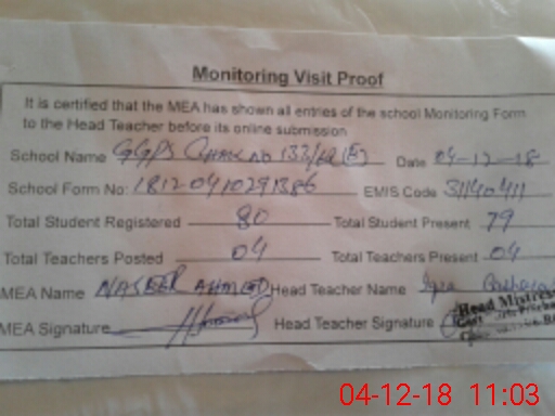 | Attendance Register | Head Teacher | MEA with School | Visit Proof |