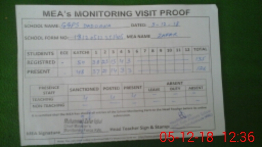 | Attendance Register | Head Teacher | MEA with School | Visit Proof |