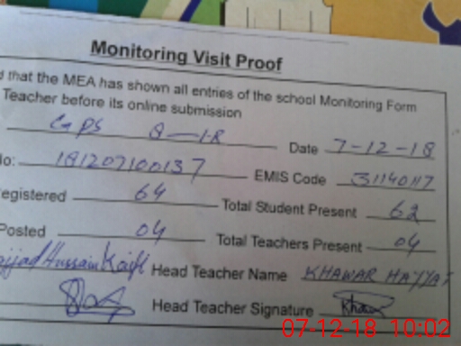 | EMIS Code: 31140117 | Name of School: GPS CHAK NO. 8/1-R | |||