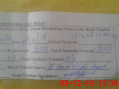 | Attendance Register | Head Teacher | MEA with School | Visit Proof |