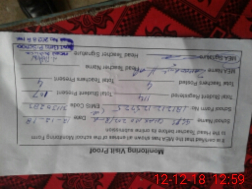 | Total no. of Classrooms: 2 No. of Classrooms Used for Teaching: 1 No. of Classrooms Storing Old Furniture, FTBs, etc: 0Comments if Any: S H N S SHAHID NAWAZ LAST VISIT THE SCHOOL DATED 21JAN 2016 AFTER NO VISIT OF THIS SCHOOL TILL TO DATE |