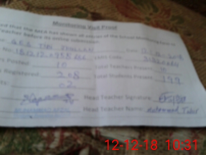 | Attendance Register | Head Teacher | MEA with School | Visit Proof |