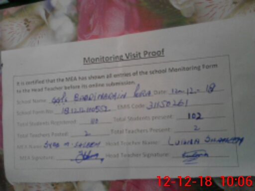 | Attendance Register | Head Teacher | MEA with School | Visit Proof |