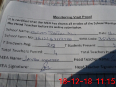 | Attendance Register | Head Teacher | MEA with School | Visit Proof |