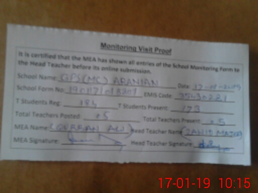 | EMIS Code: 35430281 | Name of School: GPS MC ARANIAN WALA | |||