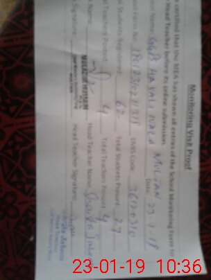 | Remarks (Use Separate Page if Required): School in bad condition drinking water not available aya said there is hand pump nearby house now I will go and fetch water at 1000 hrs garbage there aya just cleaning lately attendance not been taken since 9 January Head teacher is misbehaving with students throwing their copies and have grievances against education authority that they r not listening her complaints and I cannot check other teacher undercommand saying she has no authority AEO related must take notice please | |||||