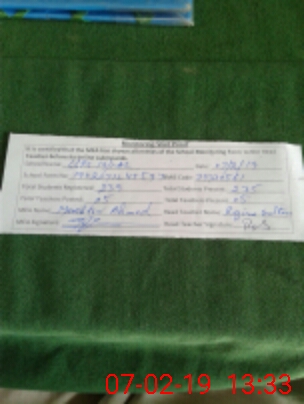 | School Visited by School Health & Nutrition Supervisor (No. of Visits) | 1 | Name1: | Khalid Javed | Name2: | |